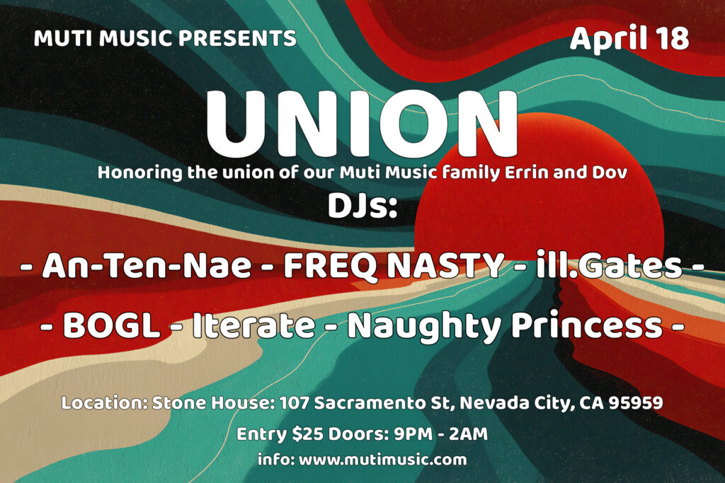 Tickets: Honoring the union of our Muti Music family Errin and Dov, who have decided to tie the knot. DJs: An-ten-nae – Freq Nasty – ill.Gates – Iterate – Naughty Princess – BOGL